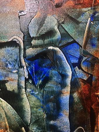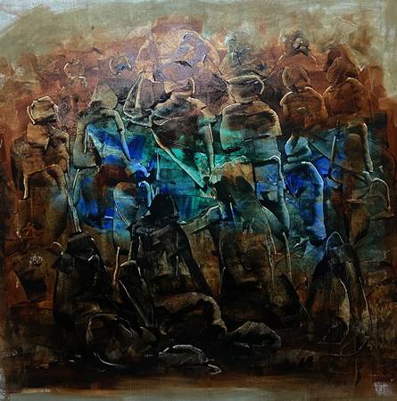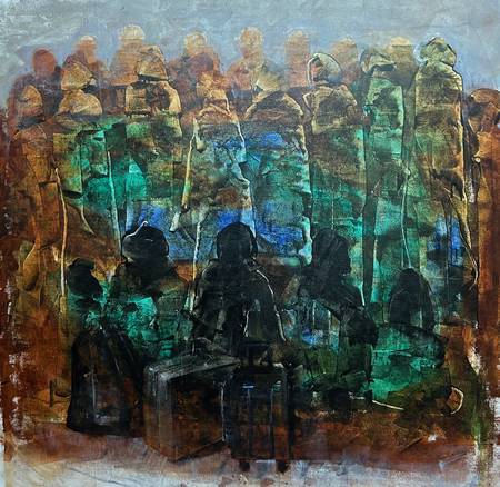 The dynamics of separation underlined with an inherent trauma informs Vishwa Sahni’s works that are at once dramatic and purposeful. It may be in the separation of families, lovers or the colossal migrations that the world is presently mired in, that all inspire Sahni to find rendition on canvas. On cursory viewing he appears to bring out only the pain and unhappiness that reflects these separations. However, there is a hopefulness when this artist assures us that deep in the heart and soul there is a binding that even in what seems an adverse situation. The growing fondness in the heart bearing the weight of the separation, stays faithful to the memory. The oils are very expressive as those who inhabit his canvas make their presence felt despite the haze they reside in. The haze they reside in screens them offering a sense of community binding as they huddle together in a shared condition, their existence never diminished.
